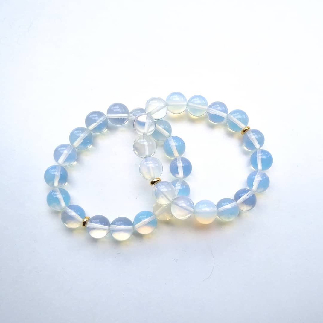Opalite (12mm), with gold stainless steel, beaded according to Chaldean planetary hours, on the day of Mercury, and the hour of Venus. Designed during the first quarter Moon in the second decan of Leo. Symbolising a love of play, that sweet moment of serendipity when the weight of the world is lifted. Although Opalite is manmade glass, it is an aspirational stone, crafting light like perhaps no other, assisting us during transitions, stabilising moods, allowing a lightheartedness, verbalising of feelings. A gem of self-worth, third-eye chakra stunner. Nicknamed Tiffany Stone – in a certain light it’s a baby blue colour like the jewellery store’s famed wrappings.