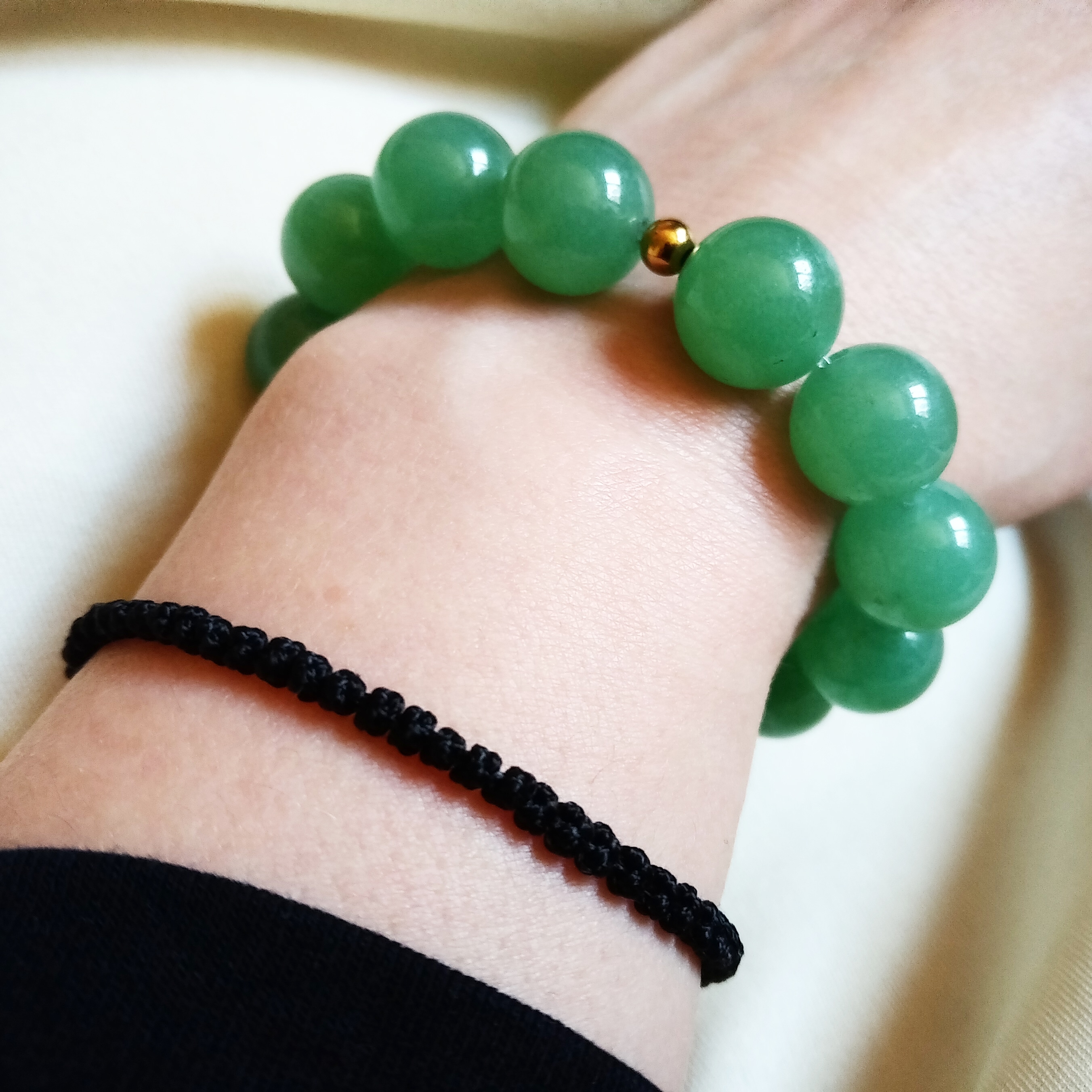 Green Aventurine (14mm), with gold stainless steel, beaded according to Chaldean planetary hours, on the day of Venus and the hour of Jupiter. Designed during the waxing crescent Moon in the third decan of Gemini. All points outlining the stone’s confidence of heart, beauty in stillness and ease in movement, good fortune due to a good character. Corresponding with the heart chakra, it is a stone of joyful abundance, a peaceful, healing presence, an optimistic call for change – gentle, courageous, quietly determined. In lore, it holds the power of disconnection, removing bonds draining our heart energy, and block our soul’s path of discovery. Restoring a love of life.