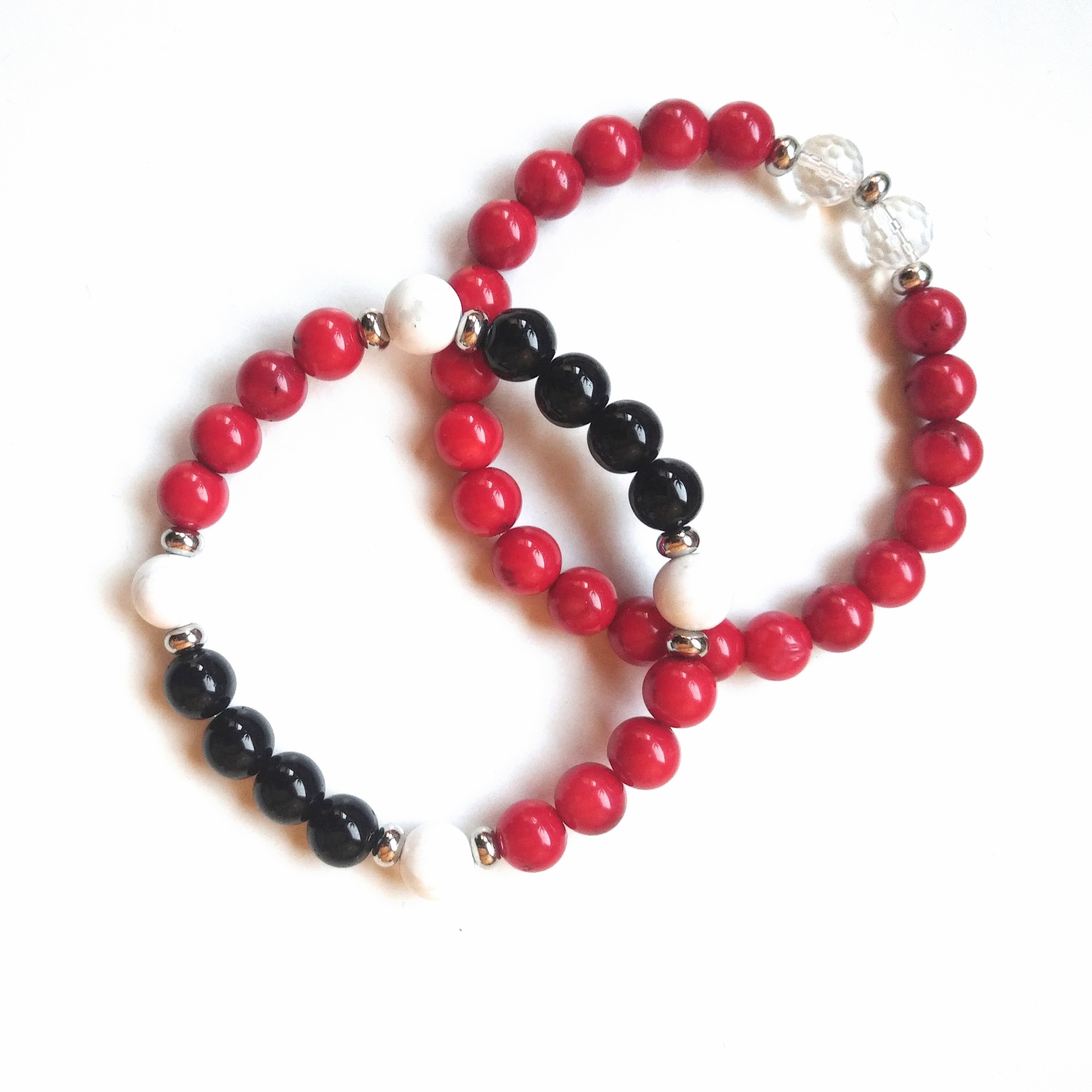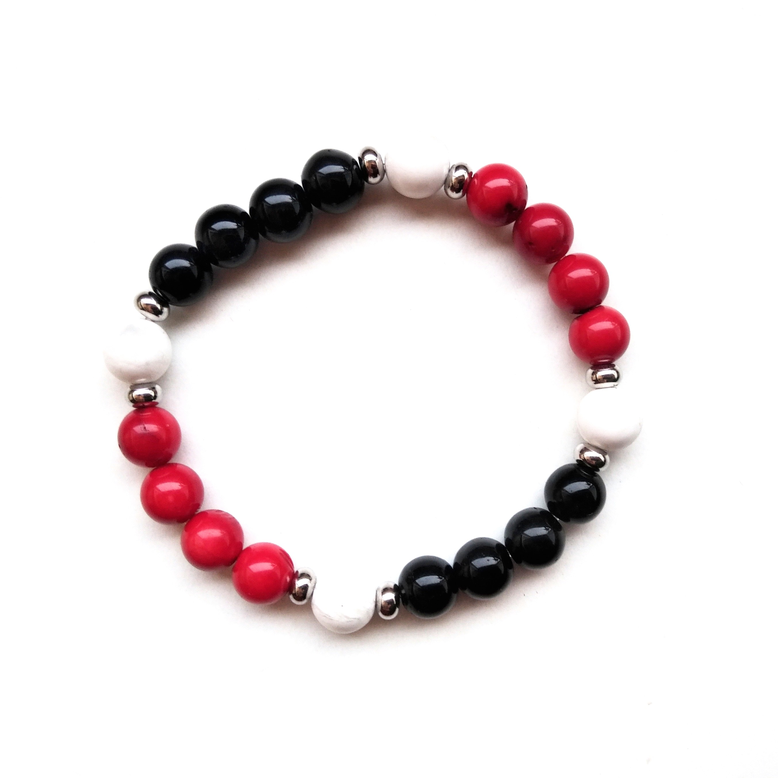 Onyx (8mm), Howlite (8mm), and Red Coral (8mm), with silver stainless steel. Beaded on the day of Venus, and hour of the Moon, designed during the waxing crescent Moon in second decan of Gemini, facilitating an awareness of the inherent duality of matter, the swiftness of the way small blessings enter and leave our lives. By adding the depth of Onyx to the protective lunar sensitivity of the Red Coral, and its special mythical powers of diverting the evil eye, then juxtaposing this full cellular grounding along the lightheartedness of a Howlite, its playful, open qualities – the patterning aims to chart the boldness of the lucky.