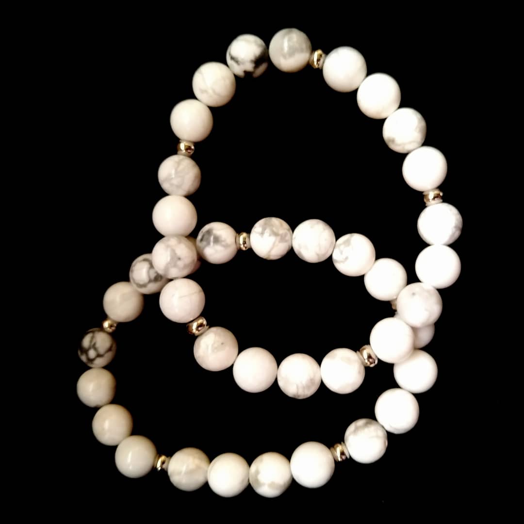 Howlite (8mm) and silver stainless steel. Designed during the waxing crescent Moon in the second decan of Gemini, and beaded according to Chaldean planetary hours, on the day of Venus and hour of the Mercury. This energetic brew embodying a vivaciousness, loveliness, curiosity, clarity, and entrepreneurship – an artful, dedicated, yet easy breeze in action. Howlite in lore corresponds to the root and crown chakras, making it a most unusual stone, grounding and inspiring – a comforting presence, reminding us of the simple joys of existence.