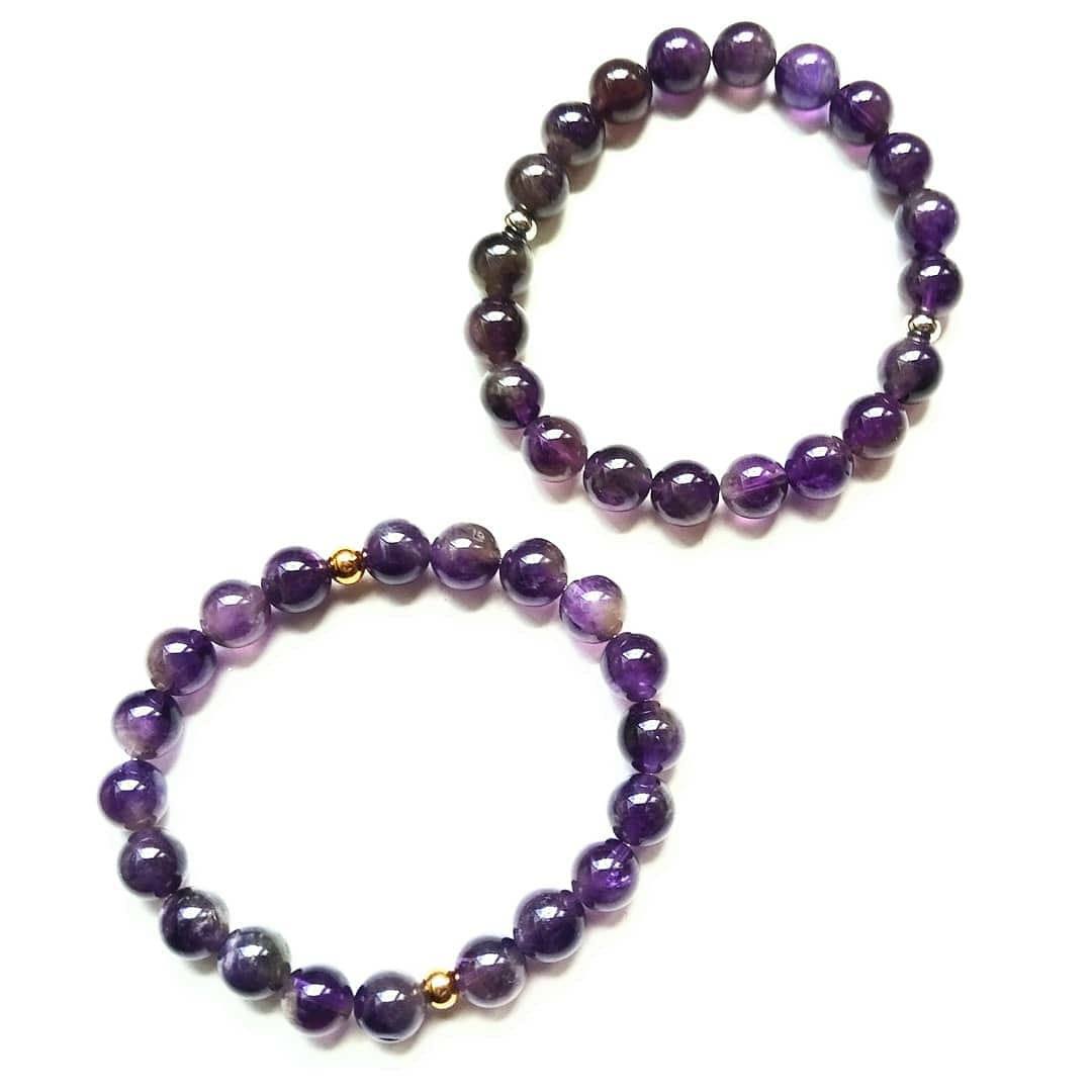 The eleventh and twelfth piece, Amethyst (8mm) and gold stainless steel, beaded according to Chaldean planetary hours, on the day of the Sun, and the hour of Moon, and Amethyst and silver stainless steel, beaded on the day of the Moon, and the hour of the Sun. Both designed during the waxing crescent Moon in the third decan of Cancer. Combining these solar and lunar points emphases the bond between the two celestials, in the sky, in our psyche, and in our bodies. In lore, Amethyst is the stone of Archangel Raphael, a third eye crown chakra and soul star gem, offering clarity, serenity, a peace of mind. In Roman myth it freed from intoxication, facilitating understanding of the roots of addictions.
