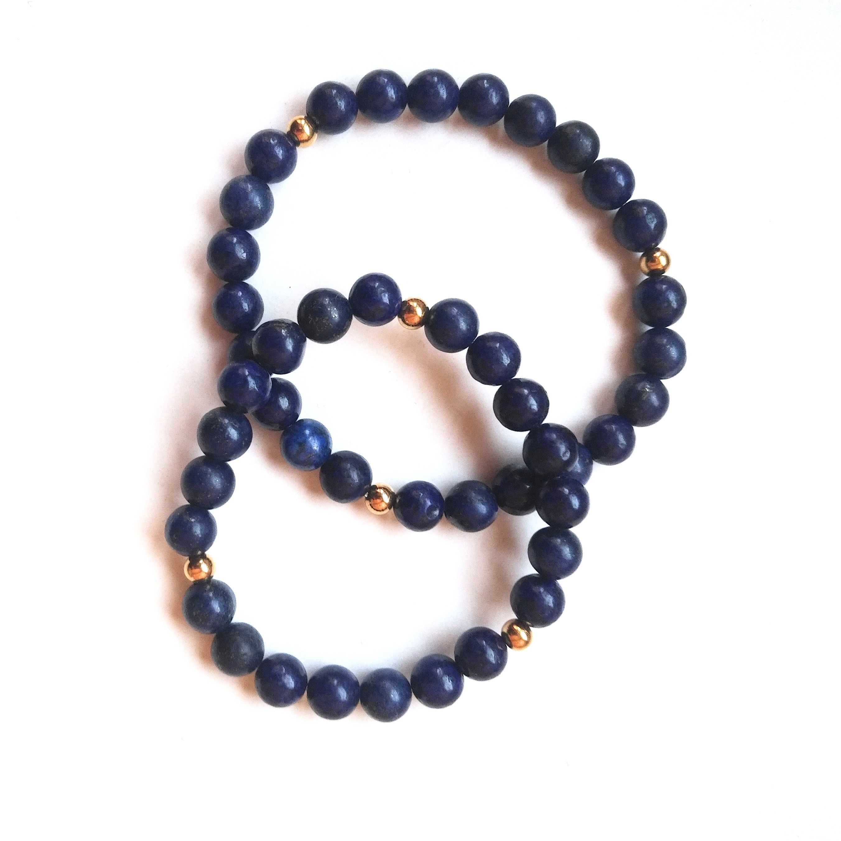 Lapis Lazuli (8mm), with gold stainless steel, beaded according to Chaldean planetary hours – smaller bracelet on the day of Mercury, the hour of Venus, larger on the day of Mercury, the hour of Jupiter. Designed during the first quarter Moon in the second/third decans of Leo. A third eye and throat chakra gem, aiding clear communication and passionate generosity. Embodies the Hermetic maxim of cosmic correspondence. The stone of Archangel Michael. In myth, goddess of love and war, Inanna, carried it into the underworld, to meet her shadow sister, Ereshkigal. Symbolises a transformation of spirit, as love is always death of ego, a rebirth of soul.