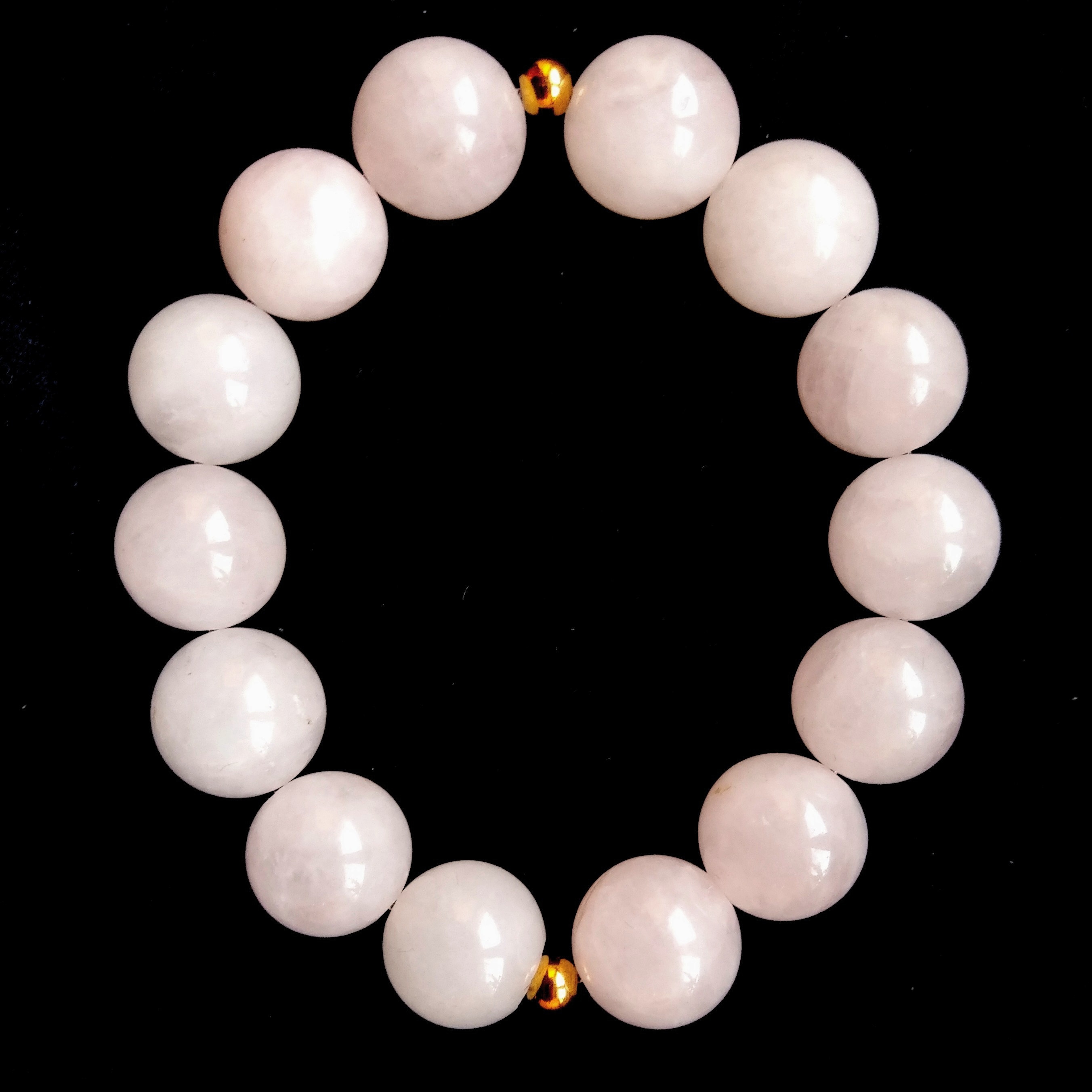 Rose Quartz (14mm) and gold stainless steel, beaded according to Chaldean planetary hours, on the day of Venus, and the hour of Venus. Designed during the waxing gibbous Moon in the second decan on Virgo. Three points embodying the three aspects of the Goddess – the creatrix, the muse, and the lover. Rose Quartz in lore is the stone of unconditional love, healing of emotional wounds, a heart chakra stone extraordinaire, also related to the third eye. It teaches us to have compassion for others by first learning to have compassion for ourselves. With this acceptance comes ultimate protection, gentle unwavering love guiding us away from harm, into the embrace of a nurturing Divinity.