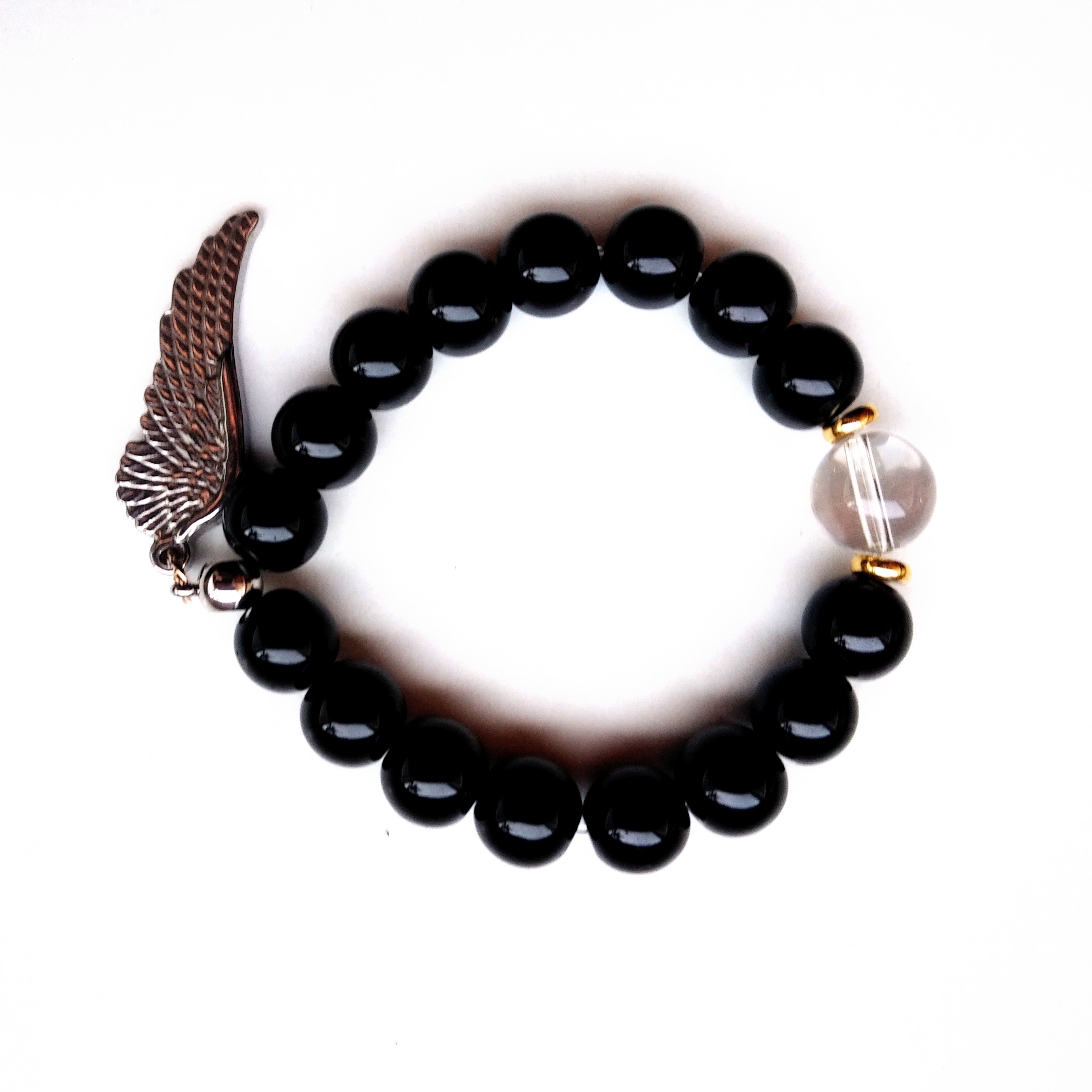 The fifteenth piece in the collection – and its backbone. Black Onyx (10mm) and Crystal Quartz (12mm), gold stainless steel, with silver stainless steel wings, beaded on the day of Jupiter, the hour of Jupiter, winged on the day of Saturn, designed while the Moon was in the third decan of Leo. This patterning embodying a supreme confidence in all worldly matters, a nobility of spirit, with a deep humility in the face of the Divine. Onyx, grounding and protective, corresponds with the third eye, and root chakras, centers the solar plexus. It focuses will, disciplines our energy, as a martial arts teacher. Quartz, master healer, purifies our auric field, offering dedicated service to others, with integrity and kindness.