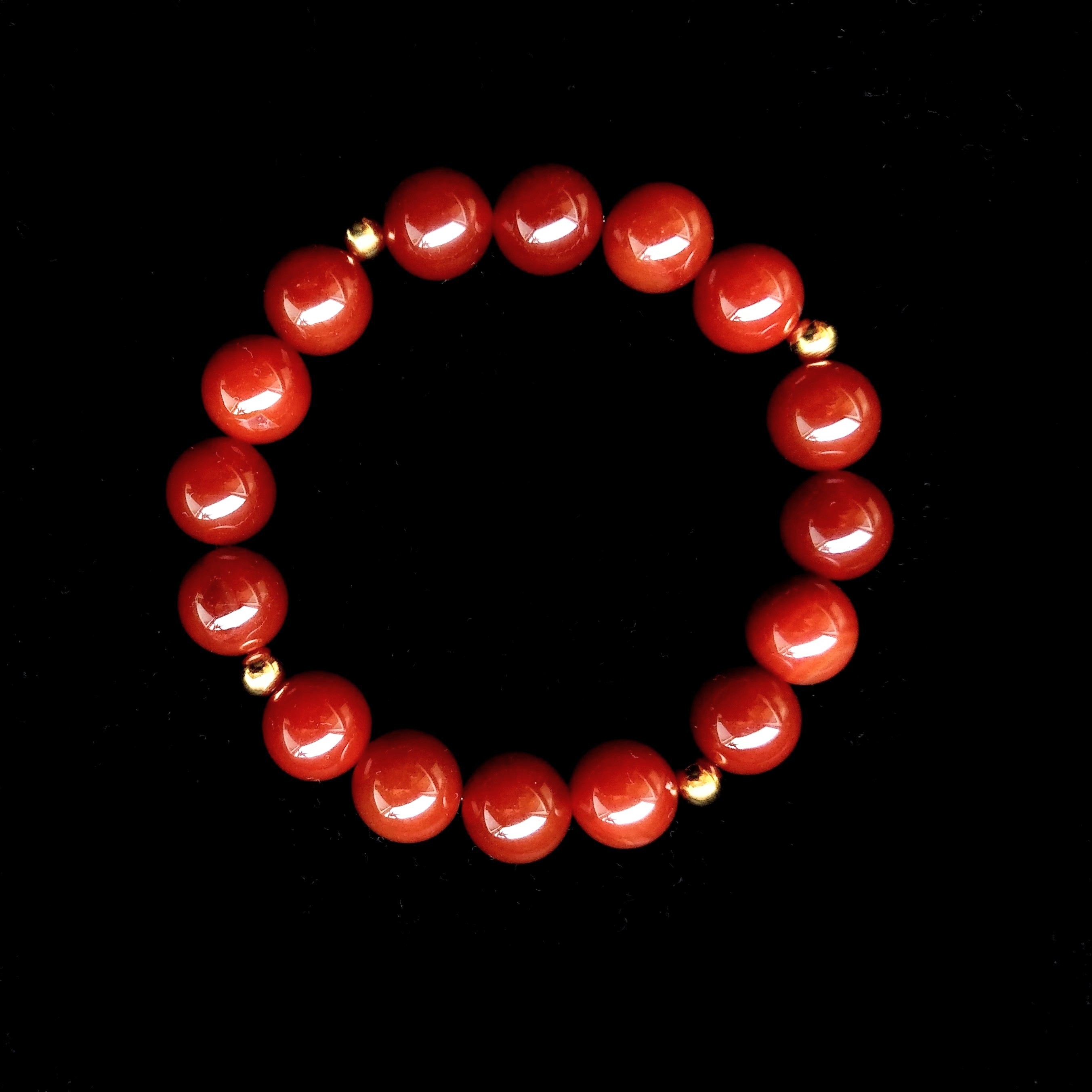 Carnelian (10mm) and gold stainless steel, beaded according to Chaldean planetary hours, on the day of the Sun, and the hour of Mercury, designed during the waning gibbous Moon in the second decan of Aquarius. This patterning offering both solemnity and serenity, solar radiance entwined with the gravitas of time, allowing for our intellects to absorb new insights, while our bodies re-energise. In lore, Carnelian is the stone of gratitude, corresponding with the base and sacral chakras, and the solar plexus. Creative, courageous, it is abundance in action, protecting from misfortune and envy, attracting good luck with its magnanimous nature, in state of grace towards fate.