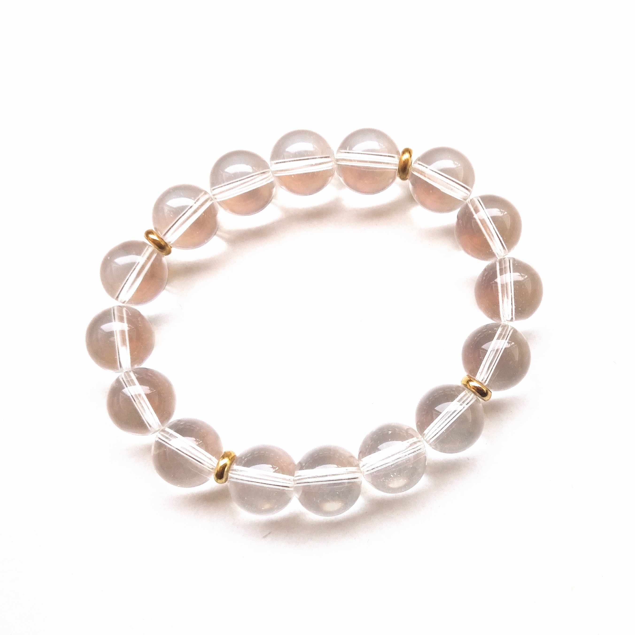 Crystal Quartz (12mm) and gold stainless steel, beaded according to Chaldean planetary hours, on the day of Jupiter, and hour of the Sun. Designed while Moon was waxing gibbous, in the third decan of Leo. Three celestial points signifying nobility, vitality, boldness, and expansion. Reminding us we are made of stardust. Quartz is the master healer. Its lore is one of purification, cell memory, harmonisation, amplification, and transmutation. It corresponds to all chakras, expanding our auric field, attuning to our own unique soul melody, dancing to its beat.