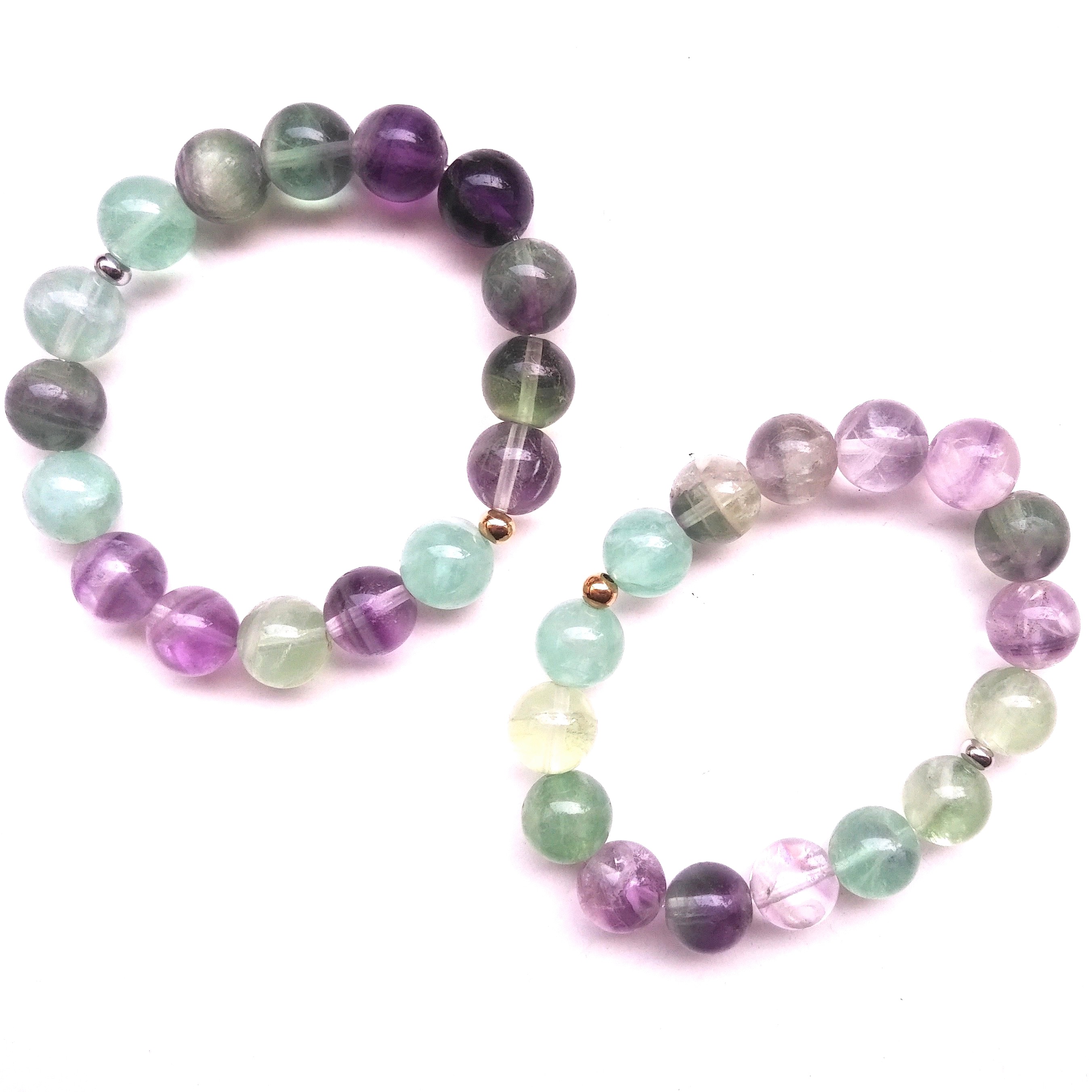 Flourite (12mm), with silver and gold stainless steel, beaded according to Chaldean planetary hours, on the day of the Moon, and the hour of Jupiter, designed during the waning gibbous Moon in the first decan of Pisces, in exact conjunction with a retrograde Jupiter in its domicile. Flourite, in crystal lore, is the stone of strength and clarity, protective in adverse environments, absorbing debris. According to Judy Hall it dissolves illusions, organising and stabilising our energy, facilitating information processing, with myriad medicinal uses, mostly related to muscular and skeletal systems. It’s a bountiful heart chakra stone, but it cleanses and balances them all, like the great muscle, itself.